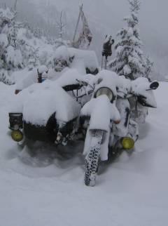 | So eine Schönheit! Ein Römergespann mit TR-1-Motor. leider für so viel Schnee nicht so geeignet - weil zu leicht und breitreifig bei geringer Bodenfreiheit ... | ![]() |