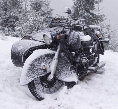 Uwe hatte bis zuletzt auf Teile gewartet, um die Dnepr nach einem sommerlichen Motorschaden treffenfit zu bekommen. Die Immler-Schneereifen kamen in letzter Minute und wanderten auf den Gepäckträger - auch einer für Christopher. Ventilfedern waren neu verbaut worden, außerdem ein Kompressorhorn und ein winkender Iwan. | |||