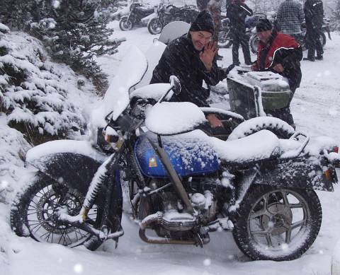 Reini mit der Winterkuh. Ihn hats ordentlich derwischt heuer - die Kupplung hats halb verbrannt, und einen Überschlag musste sie auch wegstecken - Verkleidungsscheibe kaputt ... Das speichenlockere Seitenwagenrad konnte der Sus vor Ort richten. |