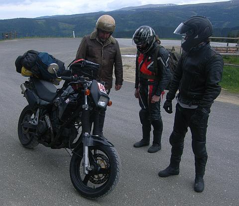 wohinein Koarrl sein Zeugs verstaut. Wir knattern über Landes- und Gemeindestraßen hintenrum (Södingberg, Piber) nach Köflach, dann per Bundesstraße über den Packsattel, wo wir gegen 12:30 eine Jause/Pause beim Cafe in St. Gertraud/Lavanttal einnehmen (Gulaschsuppe etc). Leichtes Tröpfeln aus Wolken wird ignoriert und zieht vorüber. |