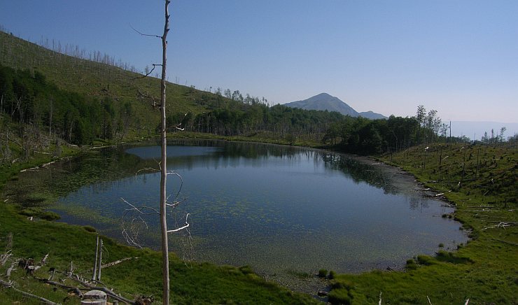 The ride goes on. Just another 10 km or so to the first lake. But before that the piste is blocked by two trucks. One of them has some tire problem, and jacked itself up on its hydraulic arm, while two guys try to repair. Turns out that one of them was our English speaking guy from that cafe yesterday - amazing. After 10 minutes or so they can move to the side and let us pass. Another few minutes and some mud holes later we arrive at the lakes. Which are pretty, but the surrounding forest must have had some wildfires in the past years - most of it ist dead, skeleton like trunks. A pity, really. |