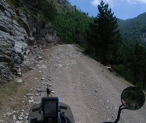 Nachdem die Fahrklamotten wieder trocken sind, und wir erfrischt, fahren wir weiter über die Gebirgskette ins Tal des Drin. Zuerst können wir nicht wirklich glauben dass nach diesem Hotelerlebnis (der Kellner hatte Schuhe an!) tatsächlich nur ein besserer Feldweg das Tal mit der Außenwelt verbindet, aber so ist es. Auch hier: die größte Straße der Gegend. Gerade noch gut genug dass die Mercedes-Busse sich nicht die Ölwanne aufschlitzen, aber holprig genug für einen Endurofahrer um seinen Wassersack zu verlieren. |