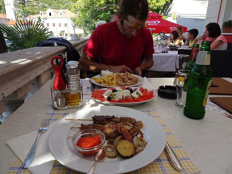 Dann endlich sind wir auf der Küstenstraße, unter Mißachtung sämtlicher Geschwindigkeitbeschränkungen (40, 60) kurven wir mit illegalen 70-80 km/h zur Kaffeepause in Senj, die wir am Meer verbringen, bei einem kleinen Campingplatzkaffee. Dann noch ein Stunderl zur verspäteten Mittagspause um 15 Uhr in Jablanac, unweit der Fähre nach Rab. Hier holen wir letztjährig Versäumtes nach und bestellen Fisch im Restoran Lux am Hafen. Gute Entscheidung!