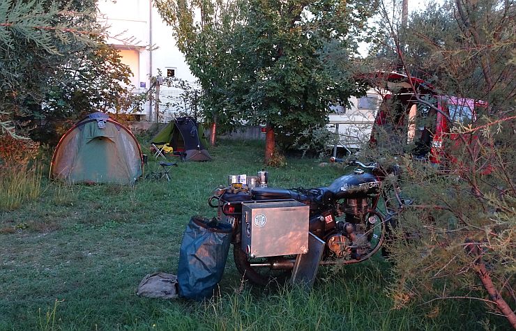 Leider fahren wir ohne Mario, der keinen Urlaub bekommen konnte. Von drei weiteren Interessenten blieb zum Schluss Thomas übrig. Der Bericht: Wir haben noch einen Termin gefunden, um drei Leute unter einen Hut zu bringen. Am Samstag 15.September geht es los! Uwe und ich gönnen uns den Luxus der Anreise auf eigener Achse, was zwei zusätzliche Urlaubstage bedeutet, und werden Tom erst in Dalmatien treffen, wohin der wegen anschließender Verpflichtungen mit dem Wagen auf der Autobahn rödeln muss. Für die Reise haben wir ein paar Hausaufgaben gemacht. Vor allem die Enfield wurde verbessert, hat einen kürzeren ersten Gang bekommen (danke Jochen Sommer) und einen versteiften Kupplungsdeckel, der das Gegenlager bei der Kupplungsbetätigung darstellt und sich serienmäßig ständig verbiegt. Außerdem verbesserte Originalzündung (Fliehkraftversteller modifiziert und Zündung neu eingestellt), Umbau von Torpedo auf Flachsicherungen, und ein neuer MITAS E-07 mit harter Gummimischung hinten. Uwes Enfield 350 "die Oilfield"