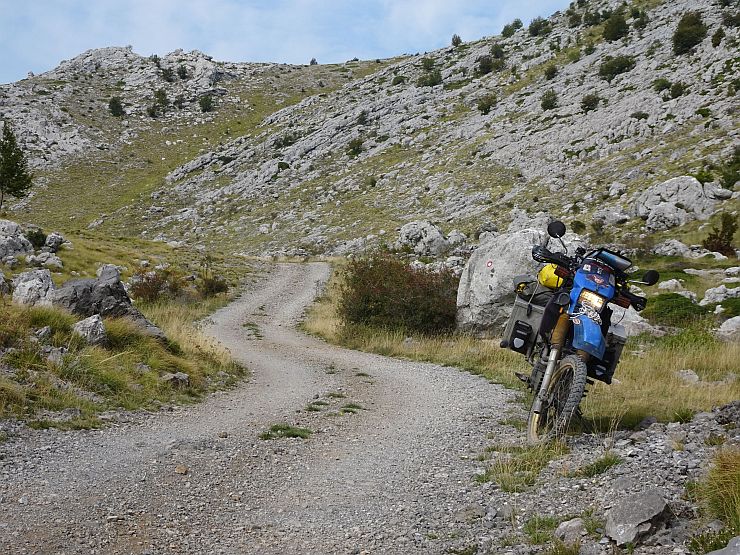 Gegen elf verlassen wir unseren Minicampingplatz, fahren 2,5 km nach Norden zum Tanken und kaufen auch gleich nebendran noch ein. Die feste Frühstückskomponente wird eingenommen. Dann geht es los. Wenige km südlich von Seline biegen wir ins Landesinnere ab und folgen dem TET-Track, das Sträßlein wird bald schotterig, eigentlich easy zu fahren und doch teilweise recht locker und tief.