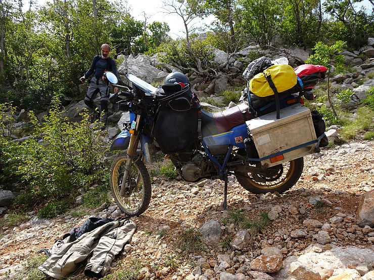 Bilanz: Keine gröberen Schäden an den Motorrädern, Uwes Seitenständer hat seine Feder verloren und das gelbe Halstuch wurde bei einer Pause am Mopped vergessen und wurde vom Hinterrad angesaugt.Ein paar blaue Flecken und Zerrungen. Nach Kaffee und Jause geht es weiter, bald sind wir wieder auf Asphalt und folgen der Strecke in Richtung Knin.