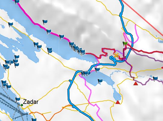 Uwe und ich haben uns eine lustige autobahnfreie Strecke ausgesucht: Zuerst über viele Kurven zu einem uns bekannten Campingplatz in Südwest-Slowenien, dann an Tag zwei die Magistrale entlang bis zu unserem Ziel in Seline, etwas vor Zadar, wo wir uns mit Tom treffen wollen. Die Strecke, komplett bei relativ warmem und trockenem Wetter absolviert, geht so: