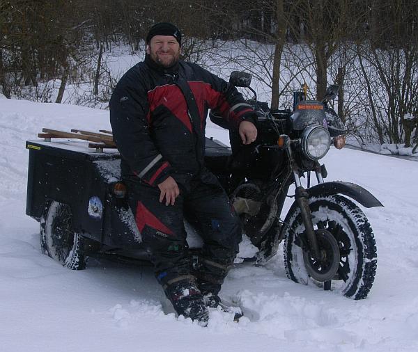 2007: Die SR500 muss als Notfallplan ins Salz - Winterbetrieb am Tauerntreffen! Der Beiwagen erweist sich als spröde, und es ist kaum Platz für Schneeketten: