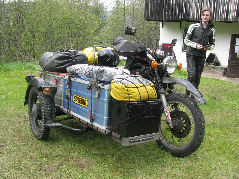 2011: Nach einem Batteriebrand tausche ich das Velorex700-Kunststoffboot gegen ein blechernes Superelastikboot. Die Regenhaube kann ich von meinem MZ-Gespann ausleihen: