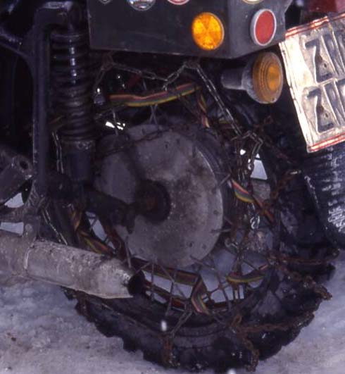 Auf einen Straßen-Gespannreifen aufgebracht (Avon MK2 oder Metzeler Gespannreifen) vergrößert sich das Rad erheblich, so dass sich die Übersetzung entsprechend verlängert. Und die Schneeketten die immer gepasst haben, jetzt möglicherweise NICHT mehr passen.