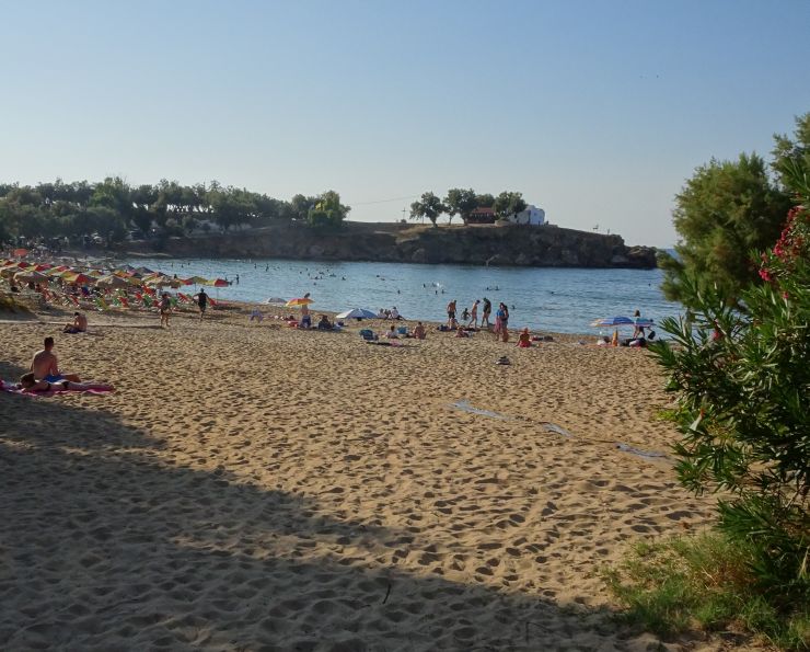 In der Stadt wählen wir kleine Nebenstraßen parallel zu den verstopften Hauptrouten, seltsamerweise lotst uns OsmAnd+ fast ausschließlich gegen Einbahnen. Egal, die Griechen machen kein Theater, solange man aneinander vorbeikommt ist alles gut. Wir durchqueren die Stadt und radeln 5 km weiter zum Camping Chania westlich der Stadt, leider mangels Alternativen meist auf der vielbefahrenen Hauptstraße. Der Platz ist mir gleich sympathisch: viel Schatten und Hängemattengelegenheiten durch alte Olivenbäume, freie Platzwahl, ruhig. Auch einen Pool gibt es. Alles für 8€ pro Nase und Steuer, zusammen 20€. Wir finden einen netten Platz neben dem Waschhaus, hängen erstmal nur unsere zwei Matten hin. Gehen duschen. Dann jausnen. Mit vier ausgeborgten Plastiksesseln erleichtern wir uns das Leben. Eine Runde schwimmen im Pool, rasten. Minimarket checken. Wäsche waschen. Spaziergang zum Strand, es sind fünf Gehminuten (oder zwei mit dem Radl):