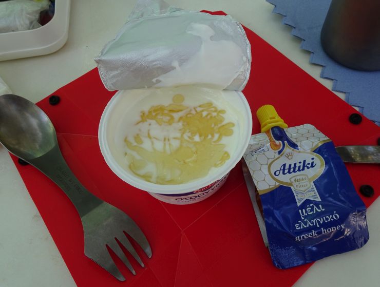 Morgens nur ein Schluck Wasser, Zähne putzen, packen und los. Beim Kloster geben wir die leere Weinflasche zurück, besuchen die Toilette, Eva holt kaltes Wasser aus dem Trinkbrunnen. Ein paar Kilometer weiter in Chora Sfakion frühstücken wir an der Kreuzung in einem Cafenion: Orangensaft, Joghurt mit Honig, Toast, alles sehr fein.