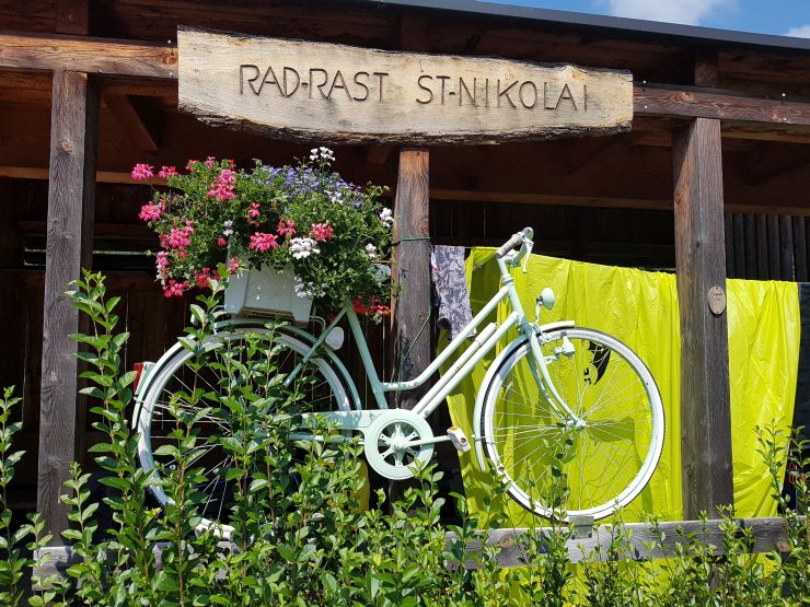 Weiter nach Ruden, es hat wieder über 30°C mittags, das erste Gasthaus hat nur Getränke, das zweite - Gasthaus Trappitsch - einen Kilometer weiter bei der Kirche ist ein Volltreffer. Wir kriegen Spinat-Topfennudeln in Butter, und Salat dazu. Und Eva einen brauchbaren Espresso! Weiter gegen 14:30 Uhr, inzwischen haben wir einen Besuch bei Evas Lehrerkollegen Thomas ab 17 Uhr vereinbart. Easy, sind ja nur 10 km bis Ratschitschach. Aber wenn man schon 25 hügelige km intus hat, kann sich das trotzdem ziehen ... speziell an einem schwülen Tag.