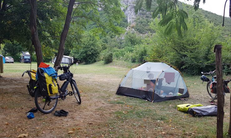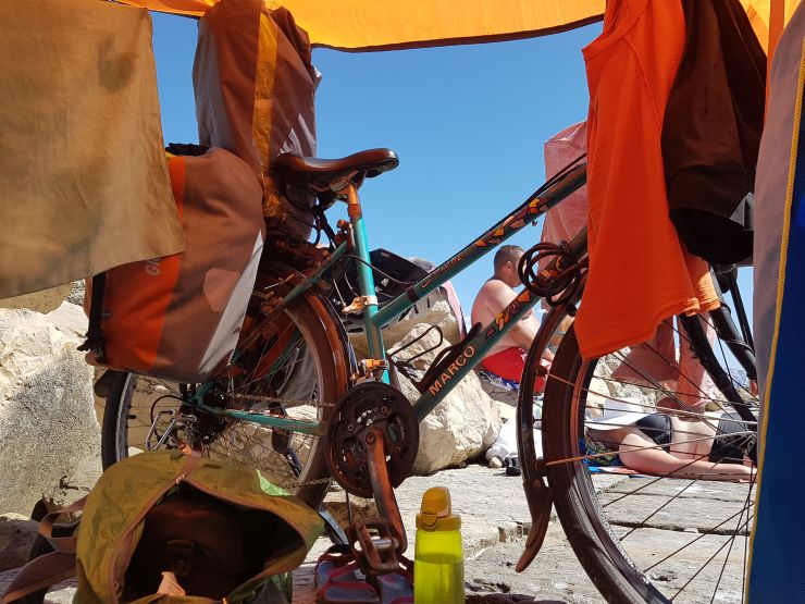 Schließlich landen wir gegen 16 Uhr am Camping Lucija, beziehen einen schotterigen aber schattigen Platz mit netten slowenischen Nachbarn. Da der Platz 35 Euro kostet, stecke ich ohne schlechtes Gewissen Powerbank und Radl zum Laden an.
