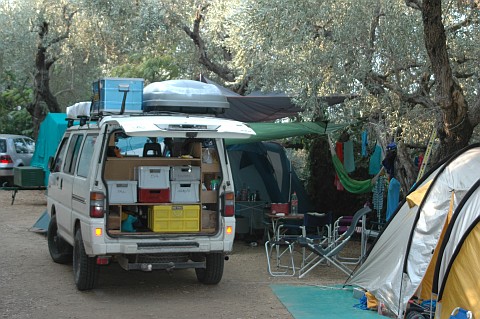 Die Nacht war ruhig und kühl, und die passierenden drei Fahrzeuge kümmern sich nicht weiter um uns. Weiße L300 4x4 Busse bzw, Lieferwagen sind hier recht häufig, und das mit dem Dachzelt ist hier eher kein üblicher Anblick und daher nicht weiter störend. Die Nacht war kuschelig - zu dritt auf 1,50 m ist es knapp, aber wir hatten keine Lust mehr im Auto alles umzuklappen und umzuräumen. Als wir nach einem fröhlichen Frühstück weiterfahren ist es Mittag - wir haben wohl den halben Vormittag auf unserem Schattenplatz verschlafen. Wir haben einen neuen Plan, nachdem uns der Nordosten der Halbinsel enttäuscht hat: über Mittelgriechenland nach Westen, nach Lefkas, wo wir vom vorletzten Jahr ein paar schöne Ecken kennen. Zuvor noch den fast am Weg liegenden Ort Kato Gatzea mit seinem Campingplatz checken ... und da bleiben wir nach einer kurzen Besichtigung hängen. Eigentlich passt alles beim Camping Sikia. Sauberes Wasser, schöner Platz auf einer Terrasse mit Meerblick und wenig Nachbarschaft, im Schatten alter Olivenbäume, kleiner Sandstrand, Taverne mit Miniladen, 25 Euronen/Nacht. Als Basislager und Ausgangspunkt für Tagestouren - klasse!