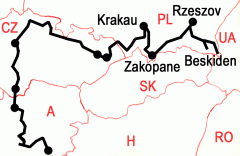 und die Beskiden Wir besuchen Bekannte von Eva und verbringen zwei Tage in der kleinen Stadt Rzeszow (gesprochen "Scheschuv"). Der Wetterbericht sagt regnerisches Wetter für ganz Mitteleuropa voraus. Also ein Einkaufs- und Besichtigungstag. Ein neuer Reißverschluss für den Tankrucksack wird erstanden und eingenäht. Auch Schuhe für Eva, ein paar nette kleine Packtäschchen, eine Handtasche und ein Geldbörsl erstehen wir - Rzeszow ist ein Zentrum der Lederverarbeitung. 3 Wochen und 2300 km liegen schon hinter uns. Weil das Wetter eher schlecht ist, fahren wir nur noch wenig im Osten herum. Immerhin bis zur ukrainischen Grenze. In einem kleinen Sklep (=Geschäft) kaufe ich kleine Wäscheklammern, die von da an zu unserer Standardausstattung gehören. Am Abend ist es im Zelt recht eng, weil´s draußen regnet und wir den Platz noch mit der geretteten Wäsche teilen müssen, die im Zelt aufgehängt wird. Weil laut Radio die Großwetterlage auch so bleiben wird, machen wir uns auf den Rückweg und lassen unser eigentliches Ziel - die Masurischen Seen - bleiben. Den Heimweg planen wir gleich so, dass wir die erste Nacht in der uns schon bekannten Jugendherberge in Novy Sasz verbringen können, 200 Kilometer sind das. Am Morgen der Abreise in Ustrzyki Gorne regnet es, wir nehmen es gelassen und frühstücken im Zelt. Den Kocher im Vorzelt lassen wir weiterlaufen, das wärmt die Luft auch ein bisserl auf. Nach etwa 100 Marmeladebroten hört es zu regnen auf, wir verlassen um 14 Uhr den Platz. Über Komanca und Dukla knattern wir auf kleinen Straßen dahin, ohne Regen, und bekommen wirklich ein Zimmerchen. Das wird bei einem Abendessen in der Stadt gefeiert, wo Anna Placki bekommt (Kartoffelpuffer). |