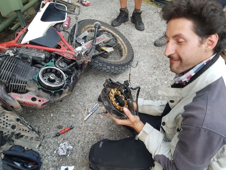 Aber er kommt mit seiner Suzuki wieder, bringt M16-Scheiben für Nattes mit. Und Ersatz für Rainers Scheinwerfereinsatz. Christoph ist mit der NTV da: