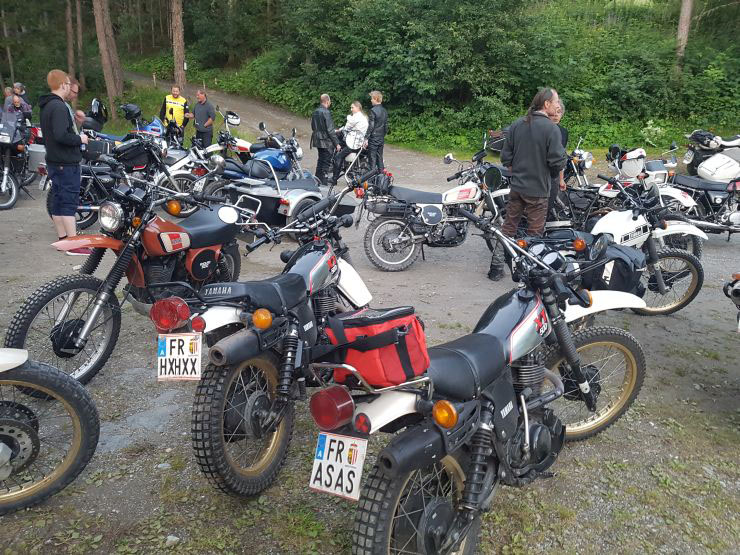 Weitgehend trocken komme ich nach 175 km gegen 21:45 mit dem allerletzten Licht am Gerngroß an. Lindi ruft an, es hat ihn auf der Anreise mit der SR hingelegt und den Knöchel etwas lädiert. Irgendwie wird aber weiter angereist. Hier die Kurzfassung: Am zweiten Anreisetag kam Lindi zu Sturz, das Hinterrad rutschte bei einer Schreckbremsung weg. Dabei wird wohl das Bein verdreht worden sein. Der Stiefel war recht stabil, belasten ging, aber nicht schmerzfrei. An der SR war ein wenig zu richten (Lenker krumm etc). Per Telefon erreichte Lindi den ca. 1 Stunde entfernt wohnenden Max. Gewartet wurde im nahen Ort, und abgeholt mit dem Transporter. Und mit oberösterreichischer Hilfe ging es dann weiter zum Treffen. Fuß wurde gefatscht und gekühlt, und dann die Hoffnung dass sich durch Ruhe über Nacht etwas bessert, ins Krankenhaus kann man dann immer noch ...