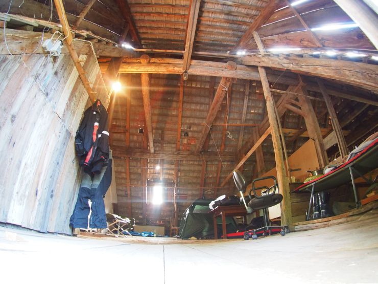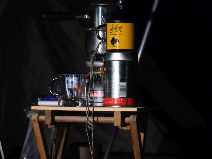 Wir stellen Lindis Zelt für ihn auf. Ein seltenes Teil mit ulkiger Stangenkonfiguration, das ist im Schein der Stirnlampen nicht intuitiv. Vor allem wenn die Stangen rot farbcodiert sind, und im Schein einer roten Stirnlampe aufgebaut wird ...