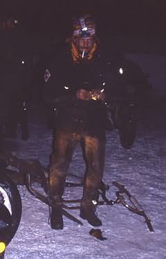 Immer mehr Leutchen tuckern herauf. Jene ohne Ketten dürfen den Schwung nicht verlieren - sonst gibt es großes Geschimpfe. Links: Dann die mit Freude erwartete Abfahrt mit dem Schifahrrad: in stockfinstrer Nacht mit 30-40 km/h Spitze und ohne Bremsen ist spannend. Deswegen geben drei Gespanne Beleuchtung und Geleit. Die brave Emme als