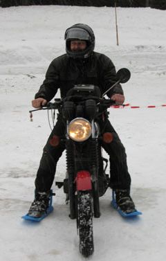 Die Ausfahrt zur Berger-Hube lasse ich aus, um aus dem Tal Material zu holen - vor allem ein Satz scharfer Bohrer und Gewindestangen sowie ein paar Schrauben sind gefragt. Meine MZ fährt einfach klaglos - ich bin ihr sehr dankbar dafür. Mit den Immler Hakaa Gespannreifen tut sie das übrigens auch ohne Schneekette - zumindest solange noch Schneereste auf dem Eis haften. |