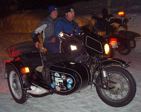 Der röhrbeinige Thomas war vorletztes Jahr mit der Solo-F650 ein paar mal hingefallen, und hatte sich deswegen ein Velorexboot drangeschlossert. Mangels Vortrieb musste er ein Stück geschleppt werden. Dabei fiel er trotz Beiwagen auch heuer um. Danach stand die Kraxn etwas schief da ... |