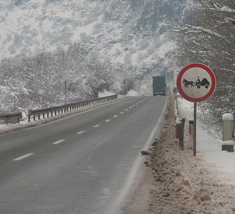 It is a close run to pass the toll hut before the road is closed for sledging at 4 - but we made it. To get up, I had to put chains on a bit later. It is snowing quietly. | ||