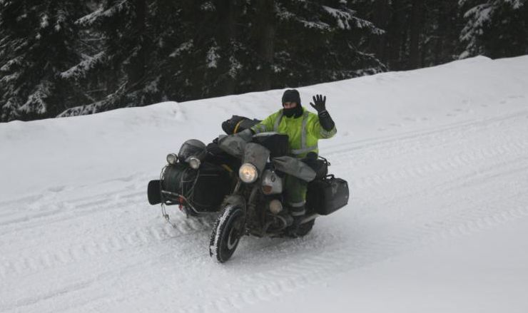 Florian sichert mit dem Motorschlitten, und Uwe darf mit hochfahren. Ich seh jetzt noch sein dreckiges Grinsen. 76 Zweitakt-PS! Nach einem sehr feinen Mittagessen und gefühlten 2000 Verabschiedungen machen wir uns dran unser Zeug in Ordnung zu bringen. Uwe muss noch eine gerissene Schneekette reparieren und für ein italienisches Solomopped einen russischen Bremshebel als Kupplungshebel einbauen. Die Scheibenbremse von Sylvie tut offensichtlich wieder, ich konnte die Guzzi gestern mit ein paar gezielten Hammerschlägen reparieren - gewusst wo! |
