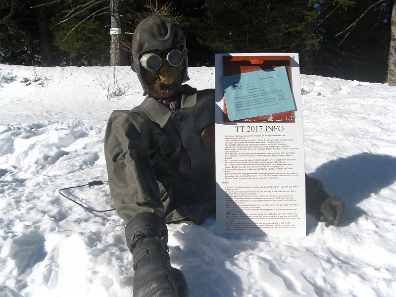 Wir haben unseren Stuntfahrer Thomas dabei, als wir den glücklosen Myke und die Italiener am Pfahlbaudorf abholen. Der glycklose Myke, dem zwei Urlaubstage abhanden gekommen waren, und der außerdem nur mit spikesbewehrten Enduroreifen versucht, die Auffahrt zu bezwingen. Etwa 500 m weit, dann fehlt der Vortrieb, also das Eis unter den Rädern. Und im Tiefschnee helfen Spikes genau nix.