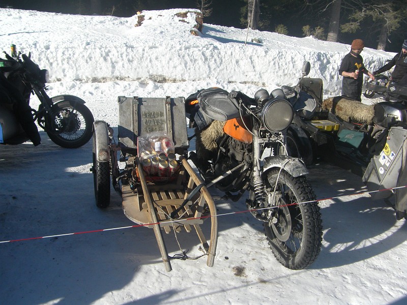 Bald darauf ist Anna mit ihren Kumpels mit neuen Schneeketten am Berg unterwegs. Leider reicht das nicht, trotz zweimaligem Elefantentreffenbesuch, um damit einfach so die inzwischen recht verspurte und wie immer steile Mautstraße hochzukommen. Da fehlt die Sicherheit auf dem ungewohnt rutschigen Untergrund. Das Mopped wird einfach zu schnell, nicht nur unter Anna, sondern auch unter den drei sie begleitenden deutlich schwereren Moppeds, also wird ständig mitgekuppelt und mit halbem Schritttempo wühlt sich die Truppe bergan.