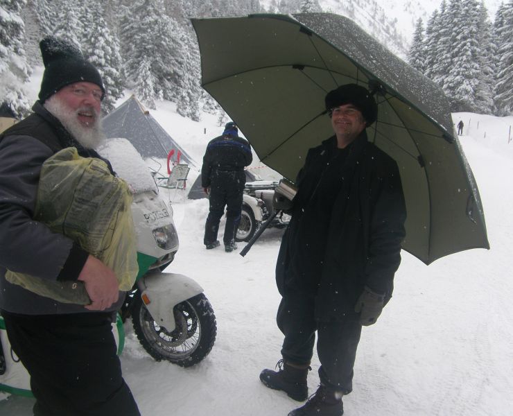 Pfanndl! Es hört auf zu schneien. Standig kommen neue und bekannte Gesichter vorbei, Zelte werden aufgebaut. Zlatko fährt weiter zum Elefantentreffen: