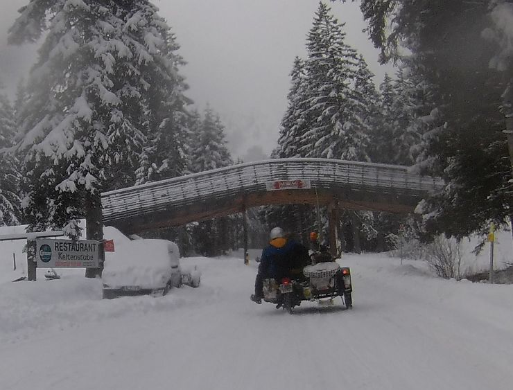 Mittags kommt Uwe nach Graz. Leider macht die Knepta Probleme, die Ölwanne ist nicht dicht zu kriegen, es drückt die Dichtung raus. Uwe zieht unterwegs zu mir die Schrauben mehrmals nach, bis ein Gewinde nachgibt. Leicht tropfend geht es nach Voitsberg zum traditionellen Koffeingetränk bei Bike Recyk, dann übers Gaberl (1550 m) zu Staudachers nach Hetzendorf. Hubert und Rosi sind fit und freuen sich über den Besuch - und über eine Schneekettenbestellung aus Kanada! Ohne Schneeketten kommen wir nicht hoch, mit Ketten geht es aber ganz easy auf den ersten Versuch. Ich liebe mein Gespann!