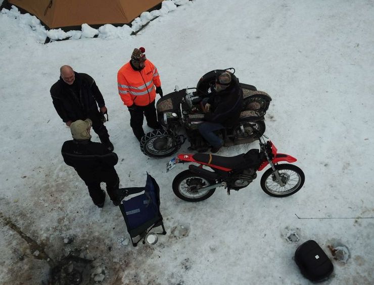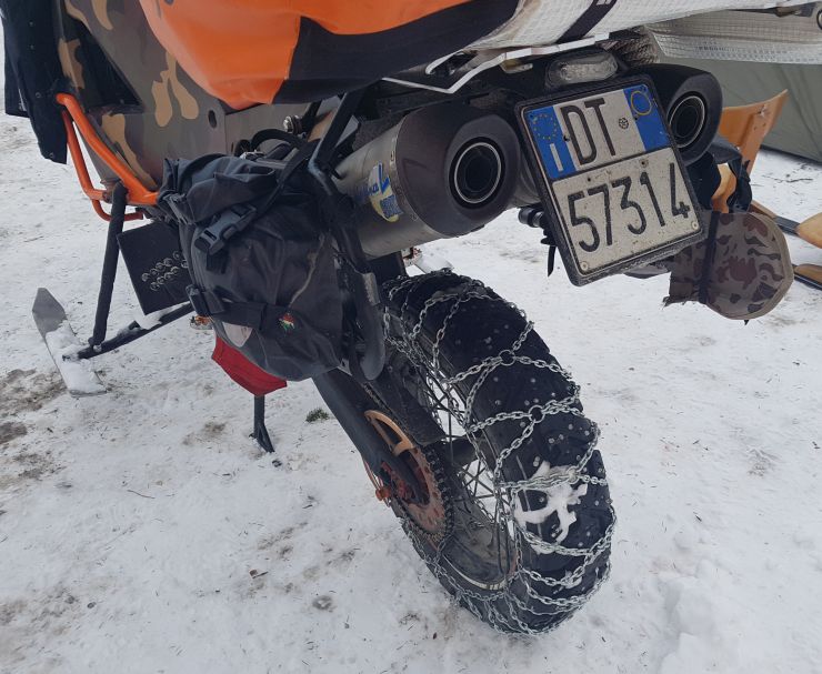 Die Aufhängung vom Endtopf an meinem SR500-Gespann beginnt zu reißen und wird mit Schlauchklemmen provisorisch geflickt. Ebenso provisorisch flickt Aynchel zum dritten Mal seine provisorischen Schneeketten: